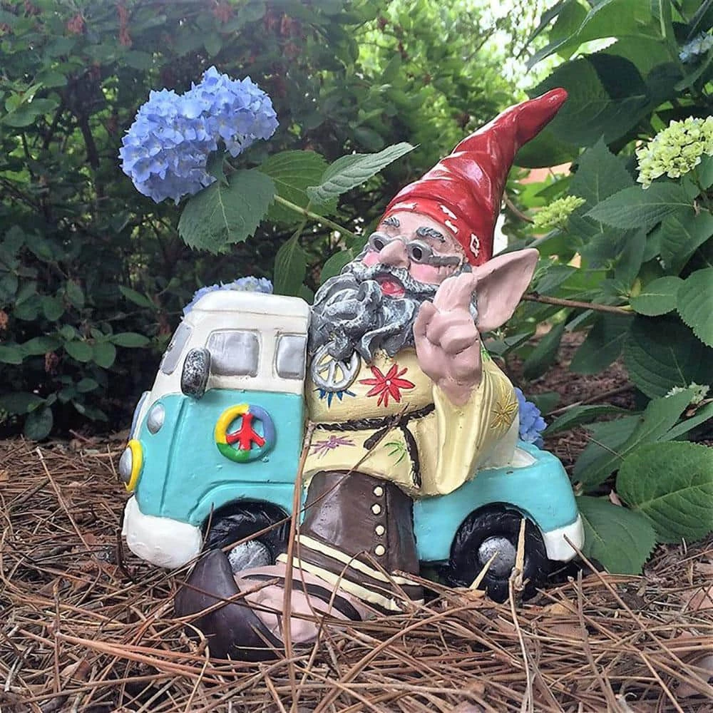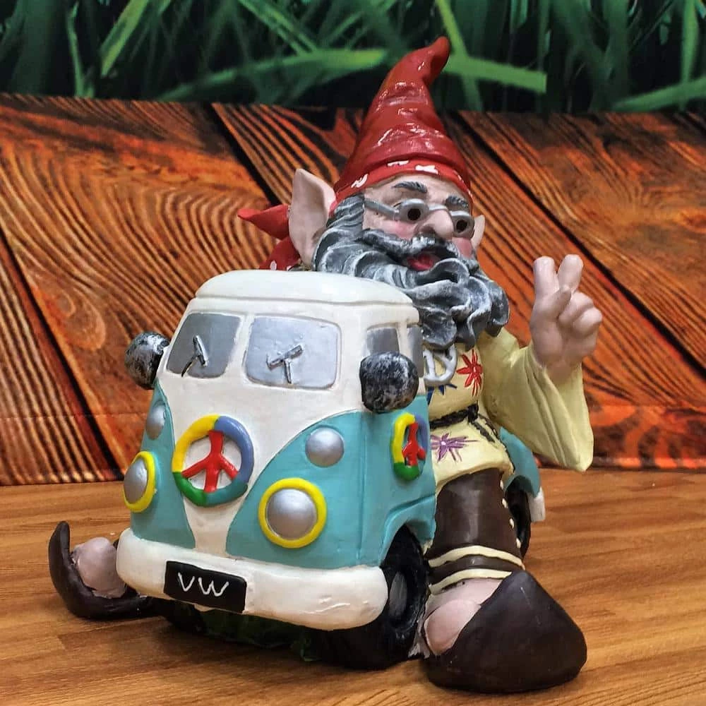 The coolest Hippie Dude Gnome Statue around. It is perfect for both indoor and out with her weather resistant and UV protectant finish. Detail from head to toe and front to back. Bring a little love, peace and rockin roll to your home, garden, pool, porch and life.