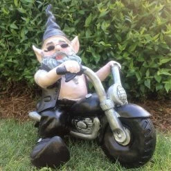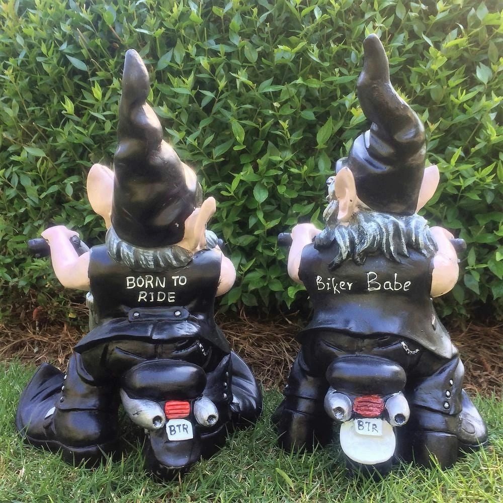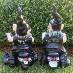 HOMESTYLES – Nowaday Gnomes – Biker Gnomes – ‘Biker and Babe the Gnomes” Riding on their motorcycles wearing leather vests, leather chaps, and blue jeans, their biker boots are naturally curved at the toe as they are gnomes, don’t ya’ know, and Nowaday Gnomes to-boot. No pun intended. Legend has it; Nowaday Gnomes occupy a parallel universe to our own, living quietly among us, they have mimicked our evolution throughout time, from scavenging for food with rocks and clubs in the ice-age to shopping and sharing emoji’s on smartphones and tablets today, they have evolved as we have evolved, done everything we have done, coveted everything we have coveted, and enjoy everything we enjoy, especially “riding motorcycles.” Nowaday Gnomes love “ridining” which begs the question; who is mimicking whom, A whimsical reminder that “they” are living among us, they measure 12 in. tall, 10 in. W and 7 in. D . The ultimate collectible home and garden figurine statue assortment for the “Biker” or motorcycle enthusiast. They are a great gift for the “Biker” couple in the family or neighborhood. The 2 pieces are sold together as a set. Other key features include; made of durable cast resin, hand painted, suitable for indoor and outdoor use, realistic UV resistant color paint finish, great gift for the gardener, and a great home decor or garden statue.