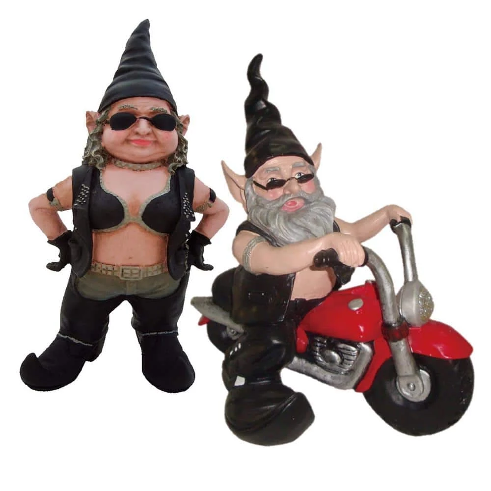 HOMESTYLES 14.5 in. H Biker Babe and Dude the Gnome Riding His 12 in. H Red Bike in Leather Motorcycle Gear Garden Statue