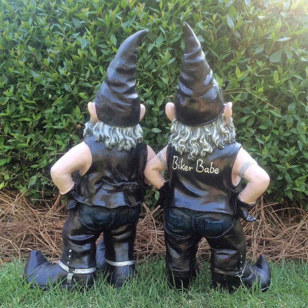 Homestyles – Nowaday Gnomes – Biker Gnomes – ‘Biker and Babe the Gnomes” wear leather vests, leather chaps, and blue jeans, their biker boots are naturally curved at the toe as they are gnomes, don’t ya’ know, and Nowaday Gnomes to-boot. No pun intended. Legend has it; Nowaday Gnomes occupy a parallel universe to our own, living quietly among us, they have mimicked our evolution throughout time, from scavenging for food with rocks and clubs in the ice-age to shopping and sharing emoji’s on smartphones and tablets today, they have evolved as we have evolved, done everything we have done, coveted everything we have coveted, and enjoy everything we enjoy, especially “riding motorcycles.” Nowaday Gnomes love “ridining” which begs the question; who is mimicking whom. A whimsical reminder that “they” are living among us, they measure 14-1/2 in. tall, 6-3/4 in. wide, and 6 in. deep. The ultimate collectible home and garden figurine statue assortment for the “Biker” or motorcycle enthusiast. They are a great gift for the “Biker” couple in the family or neighborhood. The 2 pieces are sold together as a set. Other key features include; made of durable cast resin, hand painted, suitable for indoor and outdoor use, realistic UV resistant color paint finish, great gift for the gardener, and a great home decor or garden statue.