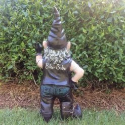 HOMESTYLES 14.5 in. H Peace Sign Babe and Dude Biker Gnome Riding His 12 in. H Black Bike in Leather Motorcycle Gear Garden Statue