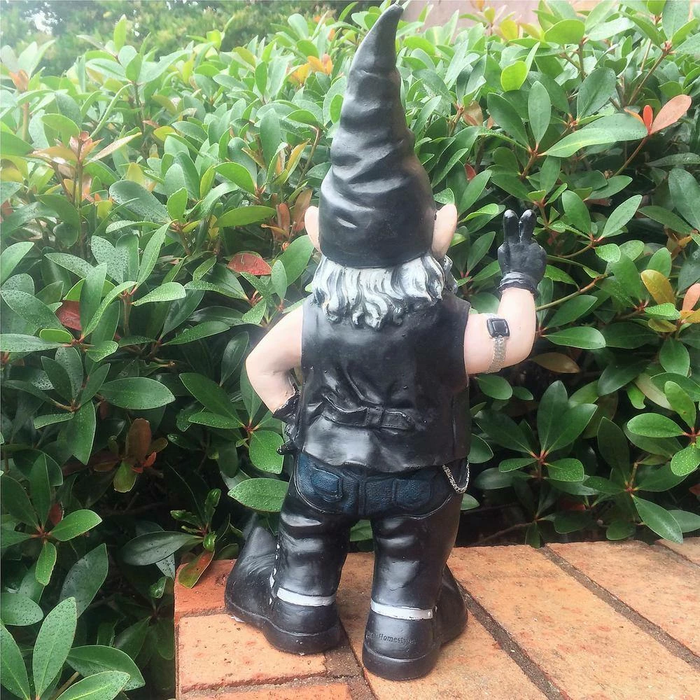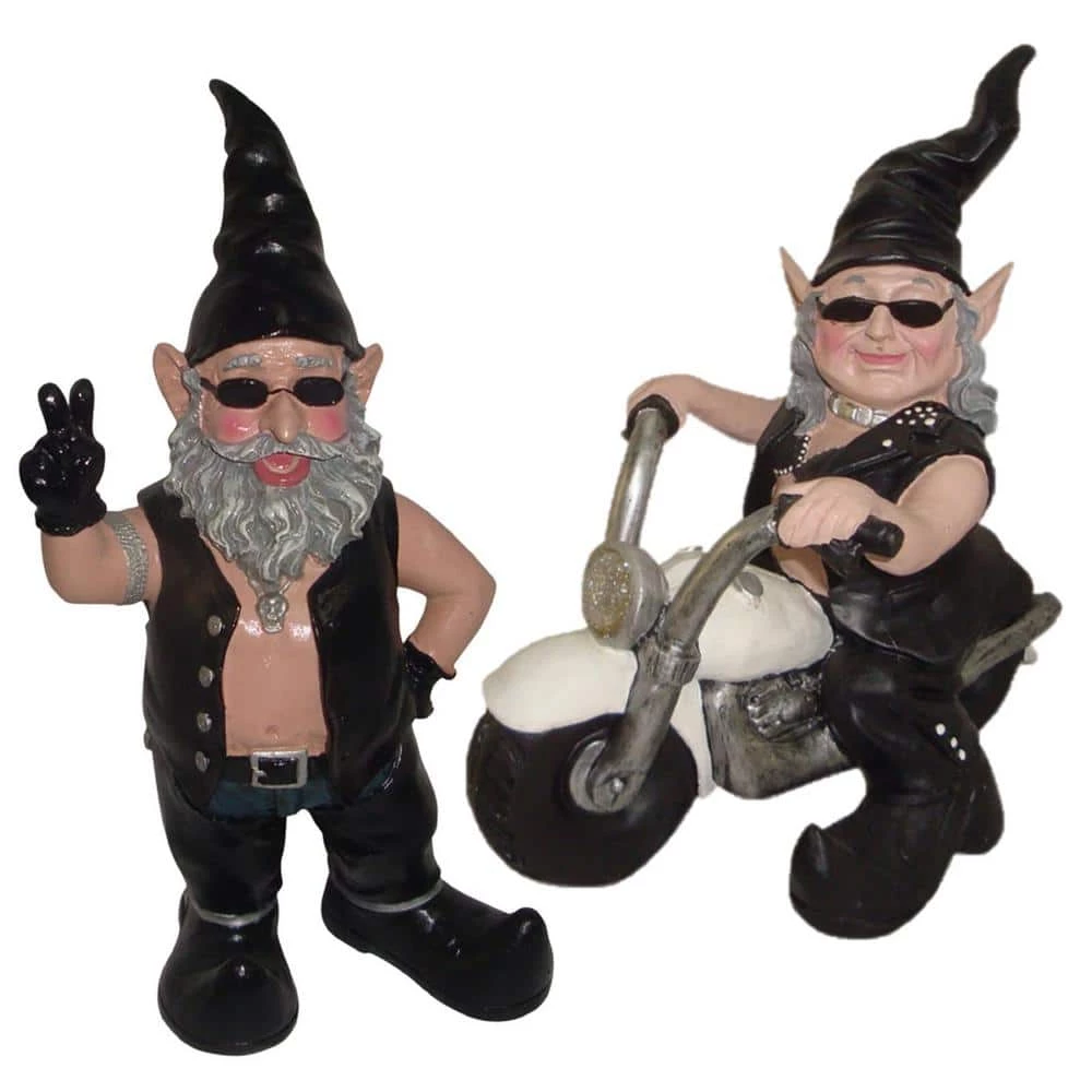 HOMESTYLES 14.5 in. H Peace Sign Biker Dude and Babe Gnome Riding Her White Motorcycle Garden Statue