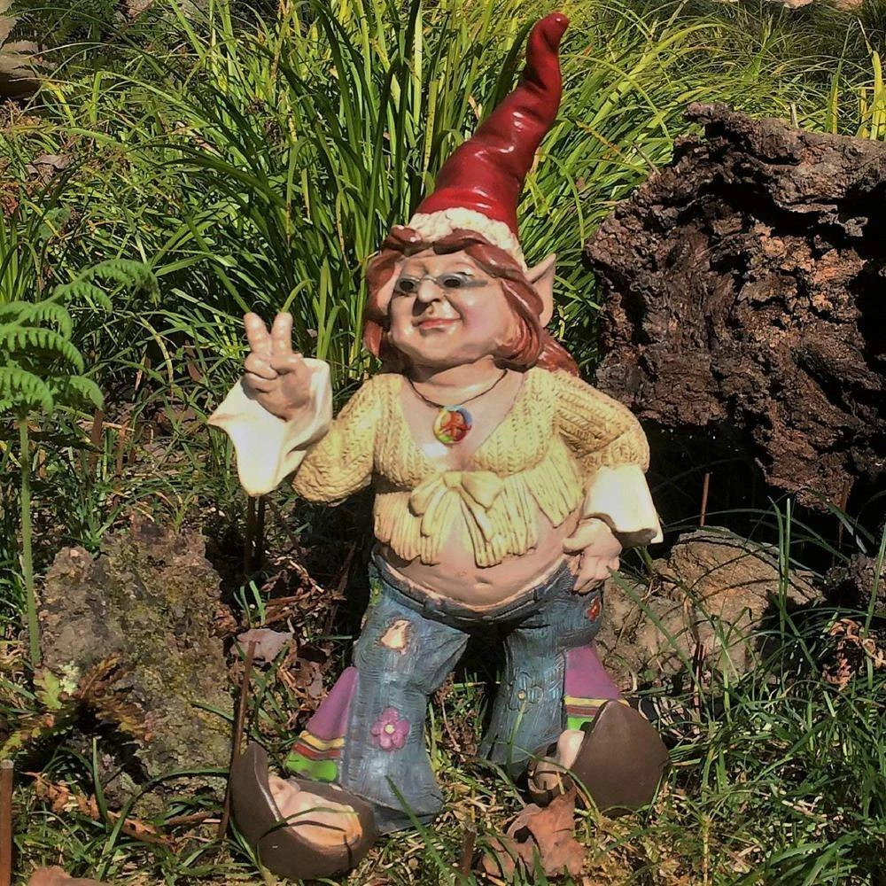 The coolest Hippie Flower Child Girl Gnome Statue around. It is perfect for both indoor and out with her weather resistant and UV protectant finish. Detail from head to toe and front to back. Bring a little love, peace and rockin roll to your home, garden, pool, porch and life.