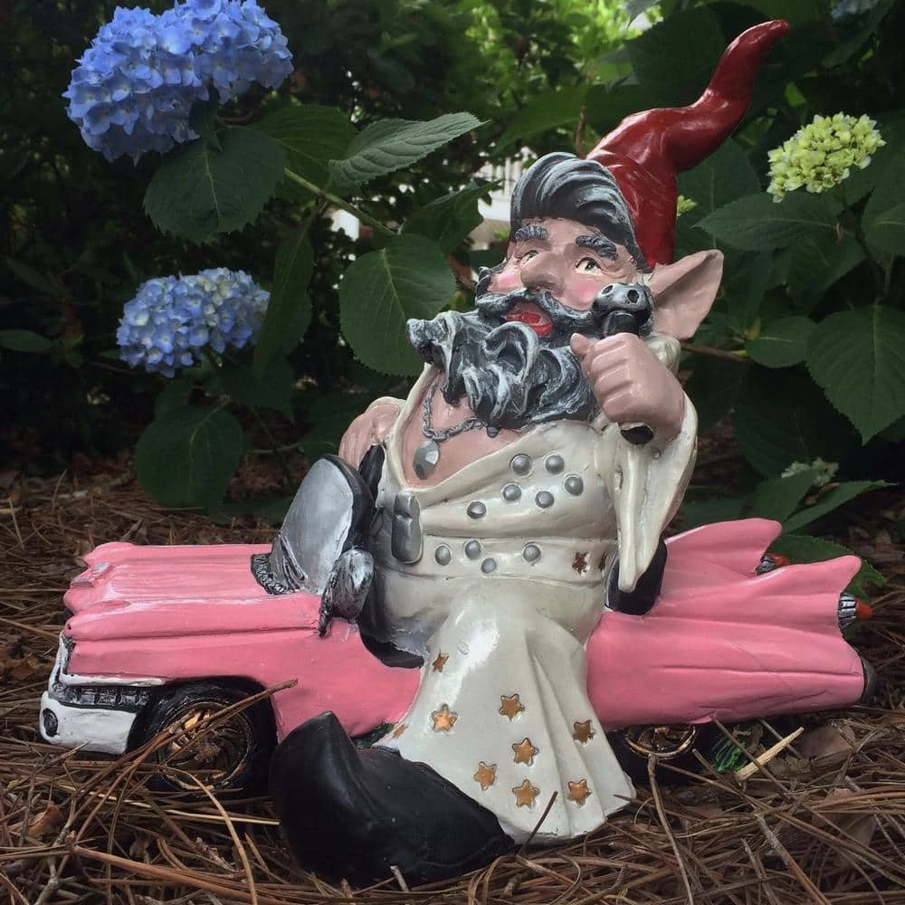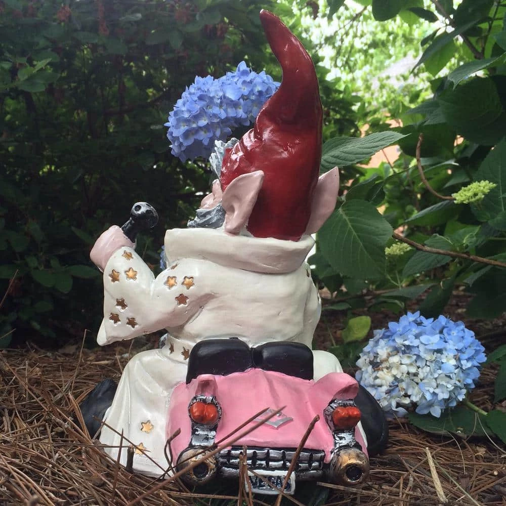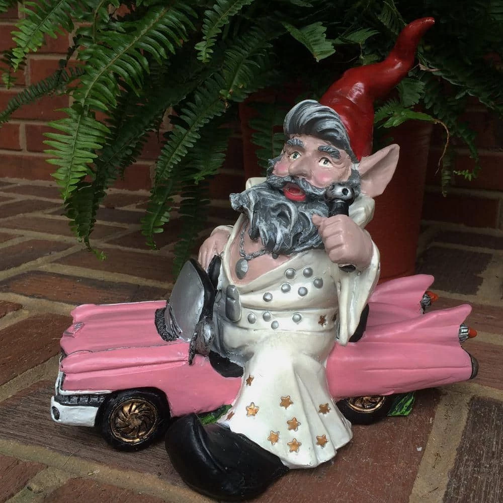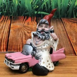 - Born to ride series-11.5 in.W x 12 in. H x 9.5 in. D Vegas the gnome riding in his pink cadillac collectible vehicle gnome