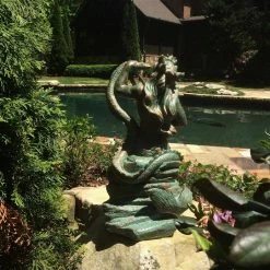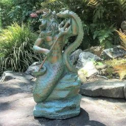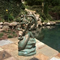 - 22 in. H x 9.25 in. W x 10.5 in. L – beautiful details in the sculpting of his face, hair, tail, scales, shells in rock, etc.