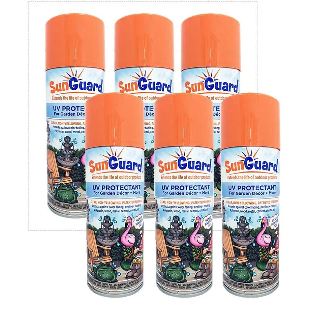 SunGuard UV Protectant helps extend the life of outdoor decor. The strong UV inhibitors protects all types of outdoor decor against fading, peeling and cracking. When dried it has as clear finish, unlike the polyurethane products, which will leave a sticky yellowish residue. Unfortunately most garden decor products come directly from the factory without any type UV protectant or a light coat which only last 1 season. Thus leaving your special investment “exposed” to the elements which cause fading, cracking and peeling. Everyone is now discovering that outdoor decor need sunscreen too. SunGuard is designed to work on resin, polyresin, wood, metal, fiberglass, cement, plastics, stone, ceramic, tile, wicker, and other hard to bond surfaces. It is not to late to protect your patio and pool furniture, collectible figurines, pots, planters, garden statues, wreaths, fountains, birdbath and bird feeder, yard art, garden gnomes, fairies, holiday inflatables and decor, wind chimes, stepping stones, and more. Net Wt. 11.75 oz. See SunGuard UV Fabric protectant for an outdoor fabric protectant.