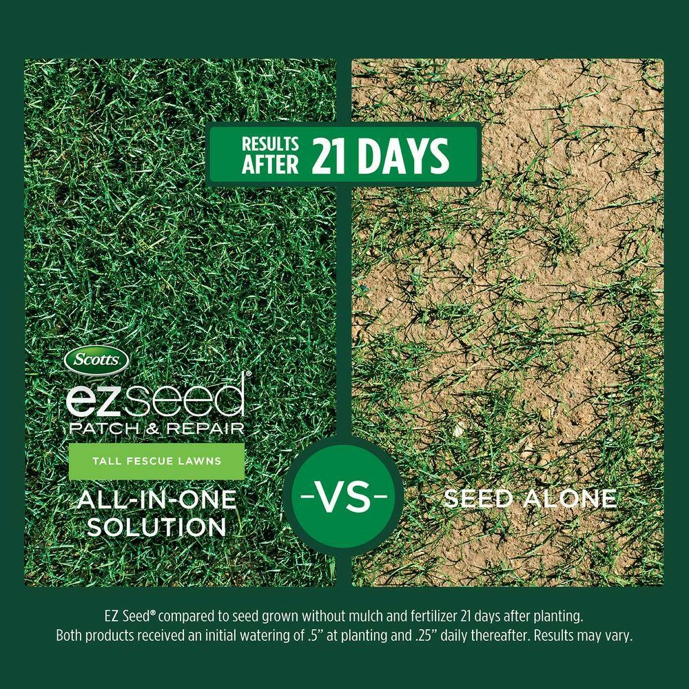Scotts EZ Seed Patch & Repair Tall Fescue grass is a revolutionary grass seeding product designed to fill in bare spots on your lawn. This Tall Fescue grass seed grows in tough conditions, including full sun, dense shade, high-trafficked areas, and on slopes. Scotts EZ Seed Patch & Repair consists of high performance grass seed, continuous release lawn food, and super-absorbent growing mulch material. Scotts EZ Seed Patch & Repair Tall Fescue grass also includes a tackifier to help reduce seed wash-away and a protectant to help keep seedlings safe from harmful diseases. There are three easy steps to success: 1) prep the area by removing dead grass and loosening hard soil, 2) evenly apply EZ Seed so the area is mostly covered but bare ground is still visible, and 3) saturate with water until no more water is being absorbed and mulch turns dark brown. Plant seed in the spring or fall when daily average soil temperatures are consistently between 55°F and 70°F, or air temperatures between 60°F and 80°F. For best results, keep kids, pets, and lawn mowers off newly planted seedlings until the grass is 3 inches high.