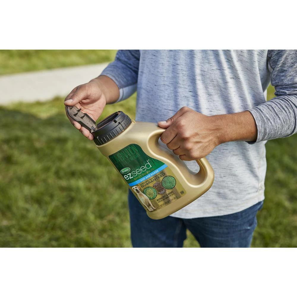 Scotts EZ Seed Dog Spot Repair has a special salt neutralizer formula that minimizes the effects of salts from dog urine and repairs up to 100 dog spots in your lawn. Dog Spot Repair Sun and Shade consists of a combination of high performance grass seed, mulch that expands to surround the seed, a soil amendment that repairs areas burned by dog urine, tackifier to help keep seeds from washing away and a protectant to help keep seeds safe. There are three easy steps to success: 1) prep the area by removing dead grass and loosening hard soil, 2) evenly apply EZ Seed so the area is mostly covered but bare ground is still visible, and 3) saturate with water until no more water is being absorbed and seed turns dark brown. When EZ Seed begins to turn light brown, it’s time to water again. Plant seed in the spring or fall when daily average soil temperatures are consistently between 55°F and 70°F, or air temperatures between 60°F and 80°F. For best results, keep kids, pets, and lawn mowers off newly planted seedlings until the grass is 3 inches high.