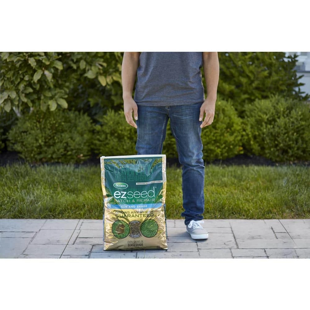 Scotts EZ Seed Patch & Repair Sun and Shade is a revolutionary grass seeding product designed to fill in bare spots on your lawn. This Sun & Shade grass seed grows in tough conditions, including full sun, dense shade, high traffic areas and on slopes. Scotts EZ Seed Patch & Repair consists of high performance grass seed, continuous release lawn food, and super-absorbent growing mulch material. Scotts EZ Seed Patch & Repair Sun and Shade also includes a tackifier to help reduce seed wash-away and a protectant to help keep seedlings safe from harmful diseases. There are three easy steps to success: 1) prep the area by removing dead grass and loosening hard soil, 2) evenly apply EZ Seed so the area is mostly covered but bare ground is still visible, and 3) saturate with water until no more water is being absorbed and mulch turns dark brown. Plant seed in the spring or fall when daily average soil temperatures are consistently between 55°F and 70°F, or air temperatures between 60°F and 80°F. For best results, keep kids, pets, and lawn mowers off newly planted seedlings until the grass is 3 inches high.