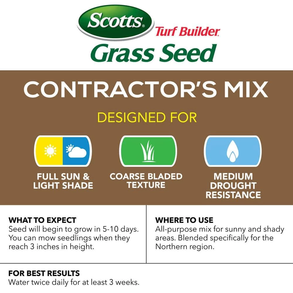 Scotts Turf Builder Grass Seed Contractor’s Mix is an all-purpose mix for sunny and shady areas. This 99.9% weed free seed has been blended specifically for the Northern region. Just prep the ground, apply the seed and water and in no time at all you’ll have a beautiful yard, thanks to Scotts Turf Builder Grass Seed Contractor’s Mix.