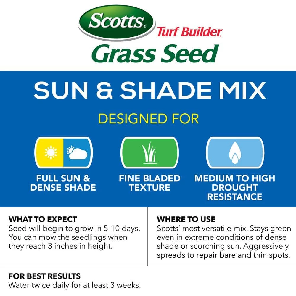 Scotts Turf Builder Grass Seed Sun & Shade Mix is Scotts most versatile mix that stays green even in extreme conditions of dense shade or full sun. Scotts wraps each seed in a unique WaterSmart PLUS Coating that absorbs 2x more water than uncoated seed, feeds with essential nutrients, and helps protect seedlings from disease. Grow Quicker, Thicker, Greener Grass. Designed for full sun and dense shade, fine-bladed texture and medium to high drought resistance. Aggressively spreads to repair bare and thin spots.