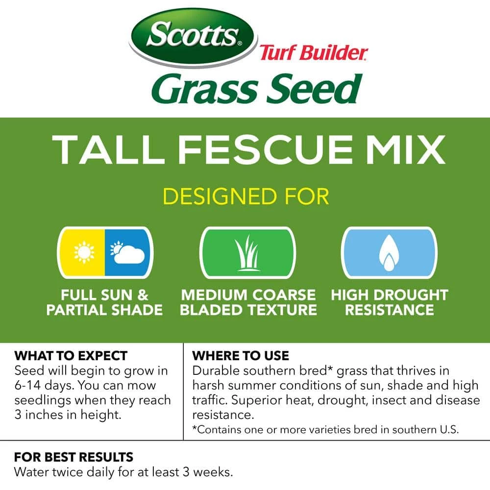 Scotts Turf Builder Grass Seed Tall Fescue Mix provides superior heat, drought, insect and disease resistance to lawns. The mix contains Southern-bred grass seed that thrives in harsh conditions like sun, shade, and high traffic. The exclusive WaterSmart PLUS Coating absorbs 2x more water than uncoated seed, feeds with essential nutrients and protects seedlings from disease. Grow Quicker, Thicker, Greener Grass. Guaranteed.