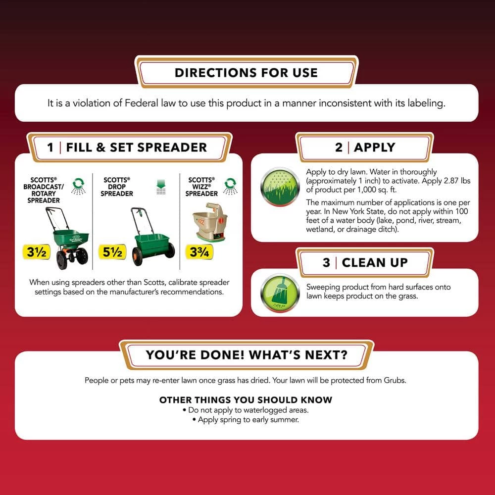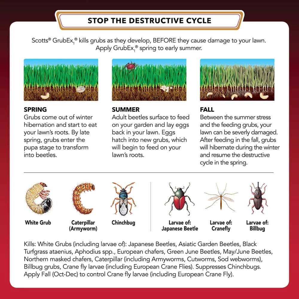 Prevent grubs from damaging your lawn with Scotts GrubEx 1 Season Long Grub Killer. A single application can stop and prevent grubs all season long. Apply during spring or early summer to kill grubs as they develop. Using Scotts GrubEx 1 Season Long Grub Killer annually can also help control Japanese beetle infestations as well as armyworms. Easily apply with a Scotts broadcast, drop, handheld, or Wizz spreader and stop grubs before they damage your lawn.