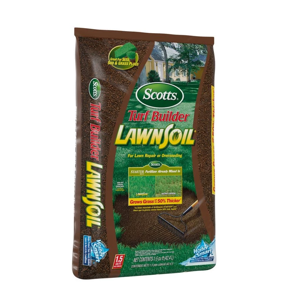 Grow grass up to 50% thicker (Tests prove Scotts Turf Builder LawnSoil grows grass up to 50% thicker compared to native topsoil) than native soil-guaranteed-with Scotts Turf Builder LawnSoil. This product has been identified as a Water Smart product, indicating that it contains a mixture of ingredients that improve moisture retention. Using Scotts will provide better germination than native soil. At the same time, the added fertilizer helps grass seedlings grow faster and stronger, leading to a thicker, greener lawn.