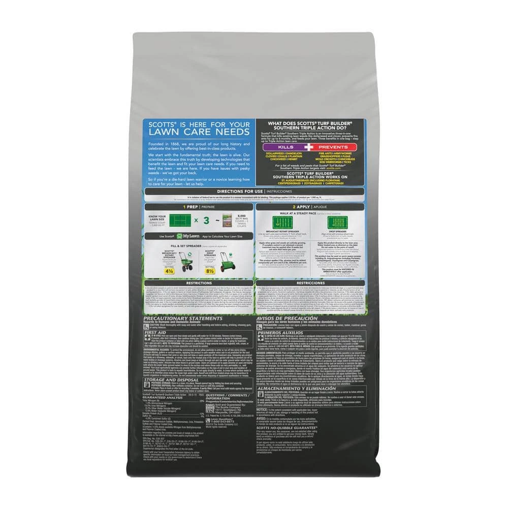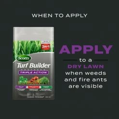 Scotts Turf Builder Southern Triple Action provides three benefits in one bag. This 3-in-1 formula kills weeds, prevents fire ants, and feeds your lawn. It prevents and kills fire ants for up to 6 months, and also controls armyworms, fleas, mole crickets, chinch bugs, sod webworms, and ticks. Kills listed weeds, including dollarweed, clover, oxalis, plantain, chickweed and henbit. Plus, it feeds to strengthen your lawn against Southern stresses like heat and drought. Scotts Turf Builder Southern Triple Action is made specifically for these Southern lawn types: St. Augustine (including Floratam), Carpetgrass, Centipedegrass, and Zoysiagrass. This product is cannot be applied to Bermudagrass. Apply with a Scotts spreader when weeds are actively growing. This product must be watered in immediately after application. Do not allow people and pets to re-enter the treated area until watering the lawn is completed and the lawn is dried. A 26.64 lbs. bag treats 8,000 sq. ft.
