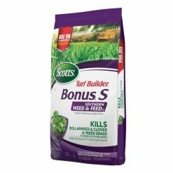 Scotts Turf Builder Bonus S Southern Weed and Feed F2 will not only kill weeds, but also thicken your lawn to help crowd out future weeds. Kills dollar weed and clover, as well as black medic, blue toadflax, buckhorn, burclover, Carolina geranium, chickweed and dandelions. Regular feedings provide the nutrients your lawn needs to look its best and withstand the stresses of heat, drought, and family activity. Use Scotts Turf Builder Bonus S Southern Weed and Feed F2 on St. Augustine grass (including Floratam), centipede grass, Zoysiagrass and carpet grass lawns. Apply with a Scotts Broadcast/Rotary spreader or a Scotts Drop spreader.
