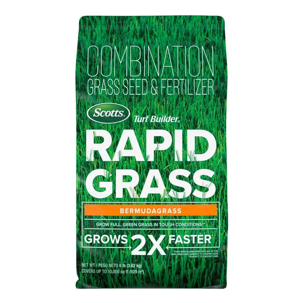 Get outside and enjoy your lawn with Scotts Turf Builder Rapid Grass Bermudagrass. With our unique, proprietary mix of seed and fertilizer in one effective formula, your lawn benefits from extended feeding, resulting in full green grass! Compared to seed alone, your lawn will grow 2 times faster (when applied at the new lawn rate, subject to proper care). Use on either new lawns or overseeding existing grass. To apply, rake the top layer of soil before applying the product with a Scotts spreader.For best results, apply this product in the spring or early summer when temperatures are consistently between 70°F and 90°F and the danger of frost has passed. Water twice daily for the first 3 weeks (or until seedlings reach 2 inches in height) to keep soil surface moist. One 8 lb. bag covers 10,000 sq. ft. when overseeding an existing lawn, and 3,000 sq. ft. when growing a new lawn. Do not use weed control products until your lawn has been established (mowed at least 4 times). If you already applied weed control, please see those package directions on when to plant grass seed. Finally, be sure to apply Scotts Lawn Food products every 8 weeks throughout the season to help maintain your thick, green lawn.