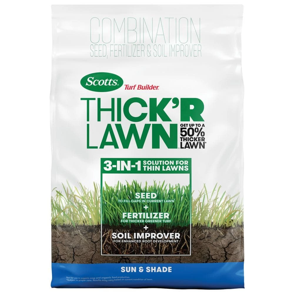 Scotts Turf Builder Thick’R Lawn Sun and Shade has everything you need to help turn weak, thin grass into a thick, green lawn. With this 3-in-1 solution get up to a 50% thicker lawn with just one application (subject to proper care). Thick’R Lawn contains soil improver for enhanced root development, seed to fill gaps with new grass, and fertilizer to feed new grass and thicken and green existing turf. This product is intended for use on an entire lawn and can be applied easily with a Scotts spreader. Results may vary based on current condition of lawn.
